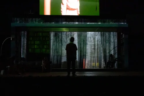 Corona allows us to wander about the vast spaces of an empty theatre; inside the twilight zone that merges fiction with reality and transforms the theatre building into an ever-changing landscape - which at times appears as an image and at times as the 'thing' it-self.